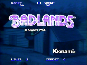 The Badlands is an animated laser adventure that adds a new dimension to coin-op-erated video entertainment, Meet Buck a hard working familyt man whose wife and children have been brutally slain by a vicious band of thugs led by the ruthless Landolf. Buck has only one mission: to avenge the deth of his family. Not until Landolf and each member of his mob is dealt with will Buck have his revenge. Can you collect the reward? There's a price tag on the head of Landolf and each member of his gang. But remember, the Bad-lands is no place for the faint of heart.